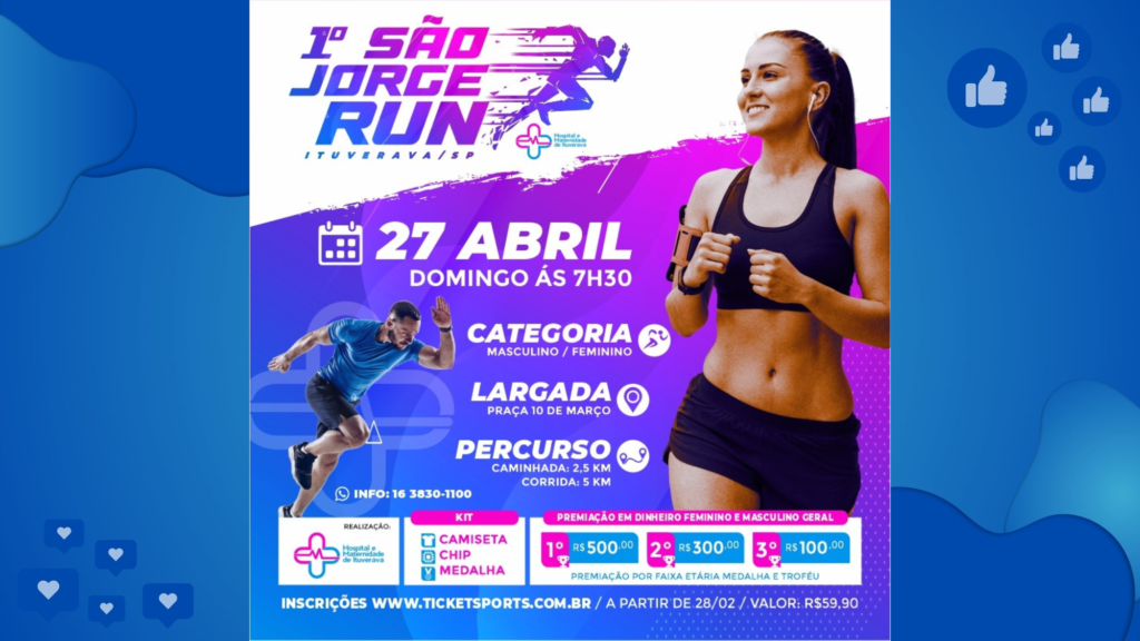 A cidade de Ituverava se prepara para receber a primeira edição do São Jorge Run, um evento esportivo que reunirá corredores e caminhantes em um percurso especial. Com largada marcada para o dia 27 de abril, às 7h30, na Praça 10 de Março, a corrida contará com provas de 2,5 km (caminhada) e 5 km (corrida), nas categorias masculino e feminino.